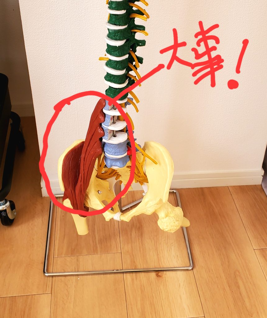 背骨・腰骨(胸椎・腰椎)の前側から骨盤の内側、太ももの付け根の体幹と下肢をつないでいる筋肉です。